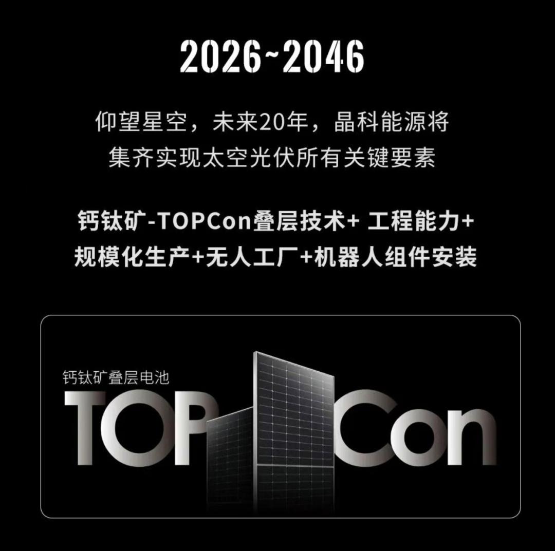 JinkoSolar also issued a rather ambitious declaration, stating that it will gather all the key elements for space - based PV in the next 20 years: Perovskite - TOPCon tandem technology + engineering capabilities + large - scale production + unmanned factories + robot - installed modules. In other words, "We want it all."