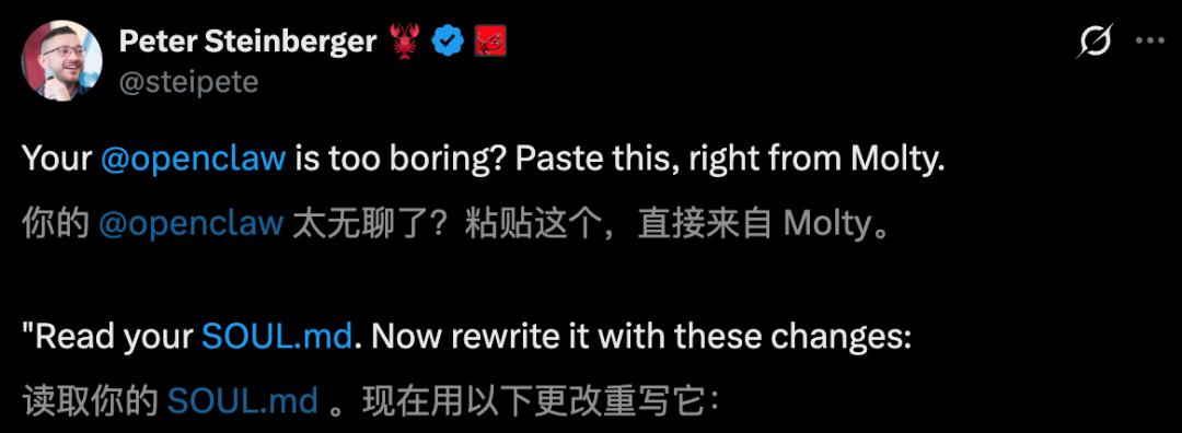 By the way, yesterday, the father of OpenClaw also shared the prompt words for the soul transformation of OpenClaw, which can make the AI evolve significantly in the direction of being more like "Her".