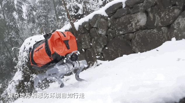 According to Unitree's introduction, this robot can walk freely in complex terrains and harsh environments. As shown in the following animated image, even when carrying a large heavy load, it can walk smoothly and even run on a steep uphill in the snow.