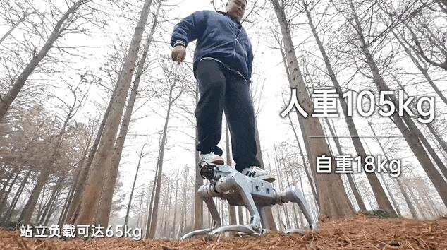 Let's directly see what this new robot can do - it can accompany you on a four - hour hike without getting tired, can catch up with an electric bicycle in speed, can carry heavy loads and run in the snow, can wade through puddles that reach its calves, and can even remain steady with a 200 - pound man standing on it. And its own weight is only 18 kilograms, similar to that of a Corgi.