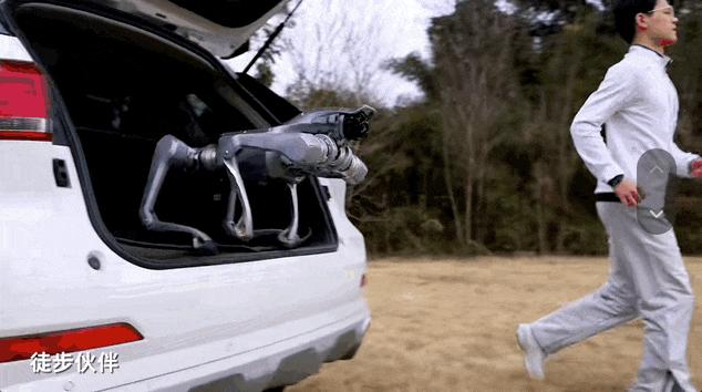 At the beginning of the video, the Unitree As2 jumps off a car and starts running with a man, showing its lightweight build similar to consumer - grade quadruped robots. The subtitle "Hiking Partner" also indicates that it can be used for sports companionship scenarios.