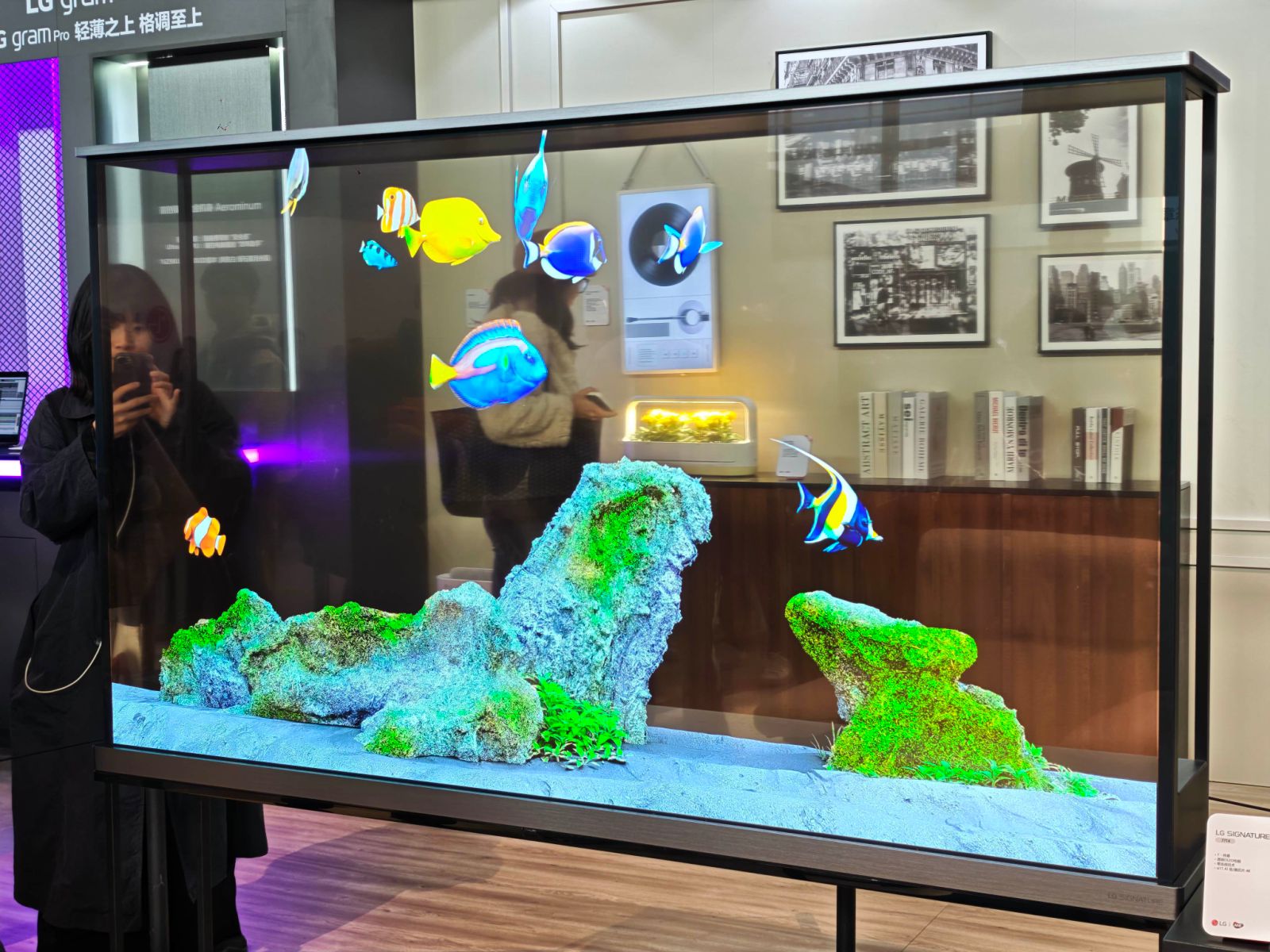 The transparent TV is an even cooler black - technology product. At the venue, LG deliberately set the picture of the transparent TV to show an aquarium. When I first saw it, I thought it was a real aquarium and even suspected it was a so - called smart aquarium.