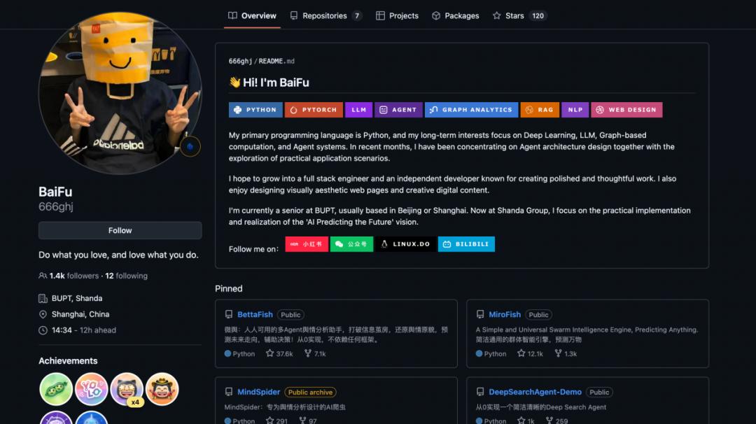 The protagonist of this story is Guo Hangjiang. On GitHub, his profile name is BaiFu. According to his personal profile, he is a student at Beijing University of Posts and Telecommunications. His primary programming language is Python, and he has long been interested in deep learning, large language models, graph computing, and agent systems. In the past few months, he has dedicated most of his energy to the design of agent architectures and the exploration of practical application scenarios.