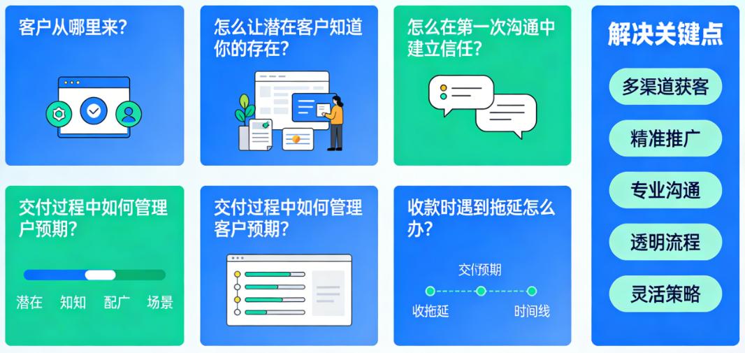 Where do customers come from? How can you make potential customers aware of your existence? How can you build trust in the first communication? How can you manage customer expectations during the delivery process? What should you do if there are payment delays? These "non - technical problems" can each become a bottleneck.