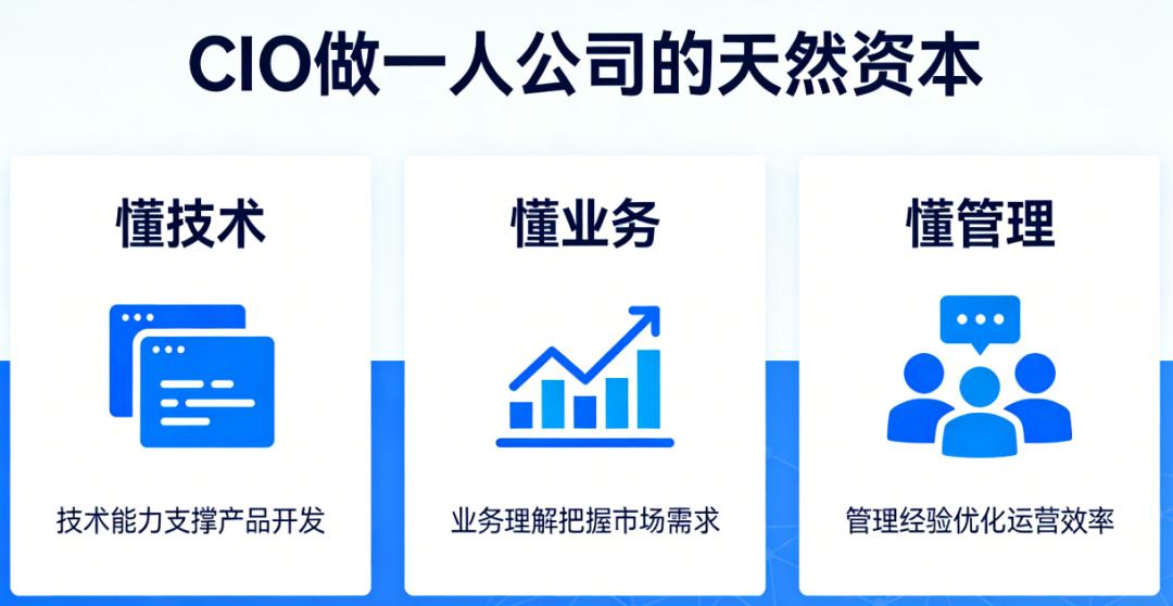 Understand management. A one - person company is not about "one person doing the work", but "one person operating a company". Quoting, signing contracts, delivering, collecting payments, providing after - sales service, and filing taxes are all tasks. A CIO has witnessed how many projects fail in an enterprise and also knows how to make a project succeed. This "pit - avoiding experience" is invaluable.