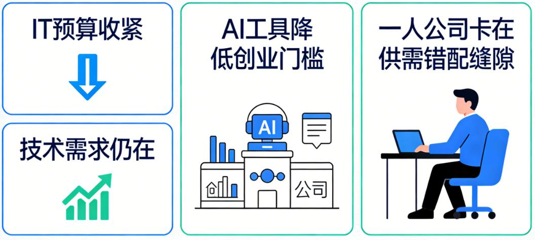 Enterprise IT budgets are tightening, yet the demand for technology persists. AI tools have lowered the threshold for entrepreneurship to an all - time low. A one - person company fits precisely into the gap between supply and demand mismatch.
