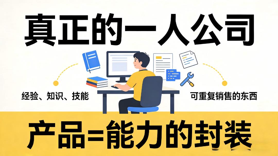 A common mistake that many technical personnel make when starting a business is: I understand this, so I'll offer consulting and training services. However, consulting and training are about selling time, which is difficult to scale. A real one - person company needs products = encapsulation of capabilities - packaging your experience, knowledge, and skills into something that can be sold repeatedly.