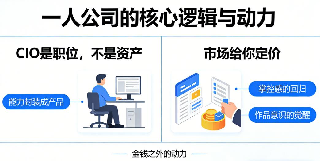"CIO" is a position, not an asset. The logic of a one - person company is: Package your capabilities into a product and let the market set a price for it. The return of a sense of control and the awakening of a sense of craftsmanship are motivations beyond money.