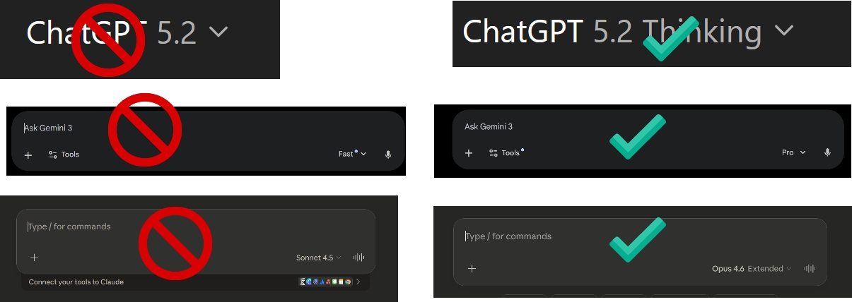 For Gemini, there are three options: Gemini 3 Flash, Gemini 3 Thinking, and 3 Pro in some paid plans. If you subscribe to the Ultra plan, you can also use Gemini Deep Think, which is used to handle extremely difficult problems (it's hidden in another menu). When dealing with serious problems, be sure to choose Gemini 3 Pro or Thinking. As for Claude, you need to choose Opus 4.6 (although the new Sonnet 4.6 is also very powerful, it's still a bit inferior), and turn on the "extended thinking" switch.