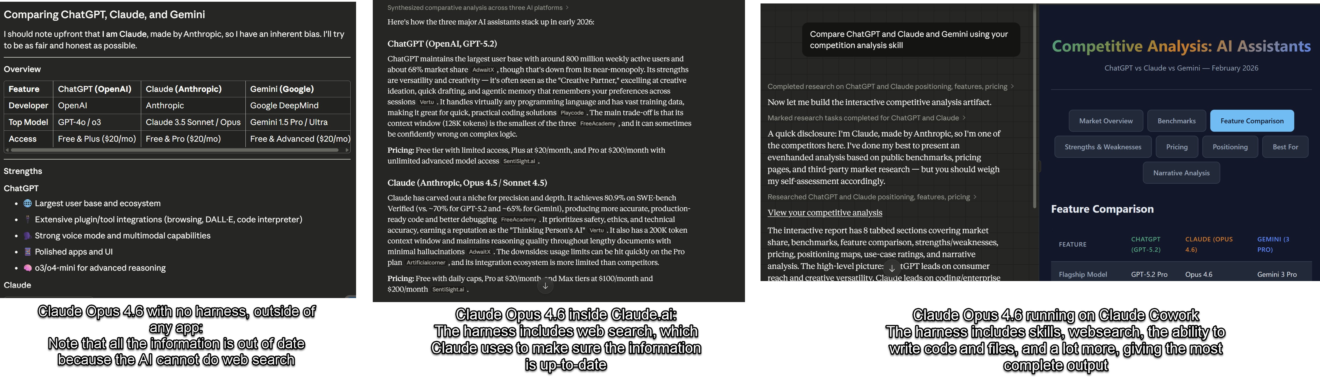 Even with the exact same model, Claude Opus 4.6, the performance varies greatly when answering the same question ("Compare ChatGPT, Claude, and Gemini") under three different applications and architectures. Without any auxiliary architecture, the information is outdated; on the Claude.ai website, I can get updated information and verifiable sources; while using Claude Cowork, I get in-depth analysis and a well-formatted itemized comparison.