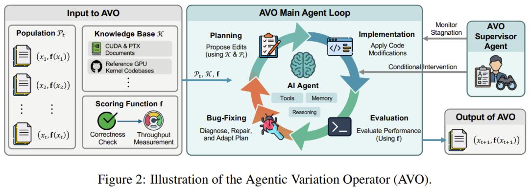 AVO breaks this limitation and instantiates the “mutation operator” as a self-driven agent loop. This AI agent can freely consult previous code version records, call domain-specific knowledge bases (such as the CUDA programming guide and PTX architecture documentation), and actively propose, fix, criticize, and verify code modifications based on execution feedback.