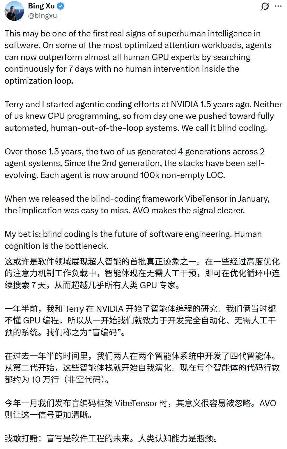Interestingly, in his tweet on X, Xu Bing also shared that when he and Terry Chen first started researching agent programming at NVIDIA a year and a half ago, they didn't know GPU programming. “So from the very beginning, we were committed to developing a fully automated system without human intervention.” They call it “blind coding.”