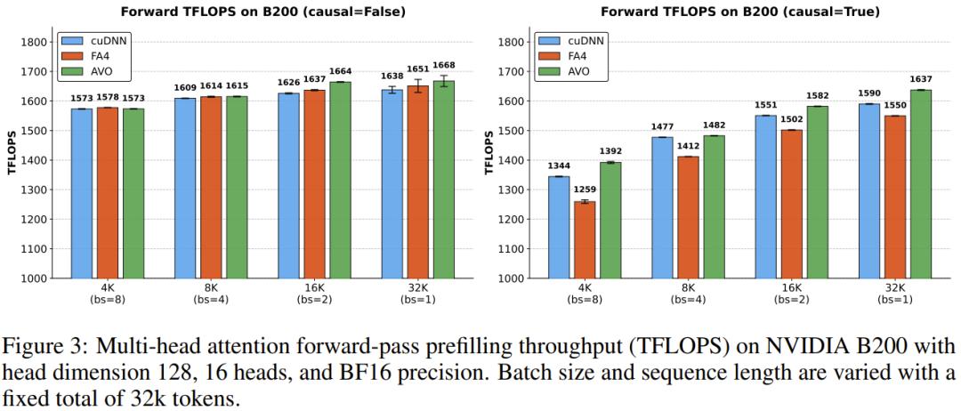 To verify its effectiveness, NVIDIA applied AVO to the multi-head attention (MHA) kernel on the NVIDIA Blackwell B200 GPU and directly compared it with the expert-optimized cuDNN and FlashAttention-4 kernels. In a continuous 7-day autonomous evolution without human intervention, the agent explored more than 500 optimization directions and evolved 40 kernel versions. The final generated MHA kernel achieved a maximum throughput of 1668 TFLOPS at BF16 precision, surpassing cuDNN by up to 3.5% and FlashAttention-4 by up to 10.5% in the test configuration.