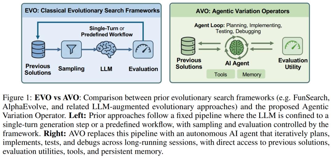 - Propose Agentic Variation Operators (AVO): This is a new type of evolutionary variation operator that promotes the agent from a simple candidate generator to a mutation operator. The agent autonomously explores domain knowledge, implements modifications, and verifies results through iterative interaction with the environment.