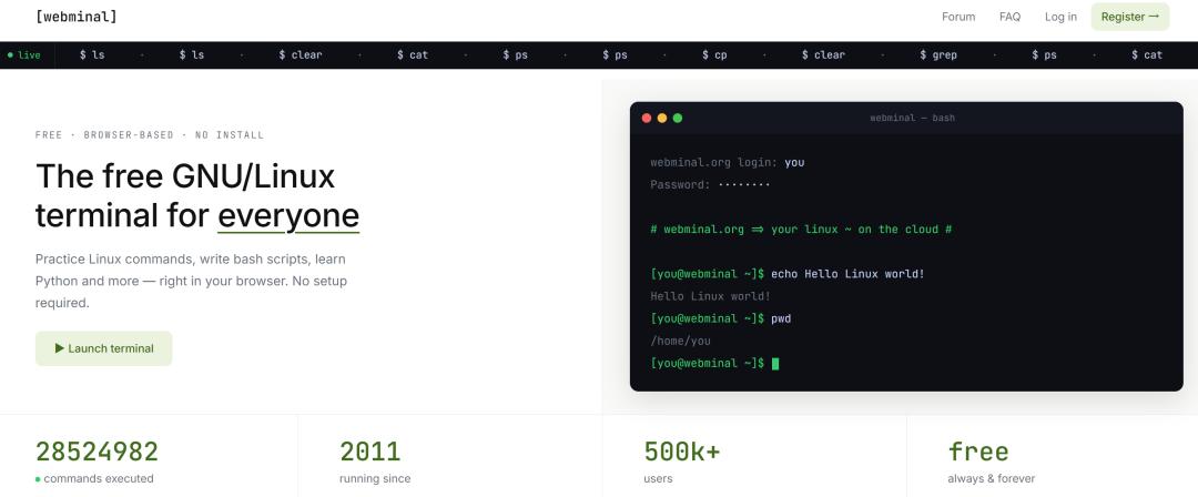 In the entire project, the only technology that can be called "modern" is eBPF. Webminal uses it to track system command executions in real - time and displays a scrolling "command stream" on the home page: ls, gcc, vim... These are not simulated data; they all come from the current real users' input and have been anonymized, showing only the commands themselves, no parameters, no paths, and no passwords.