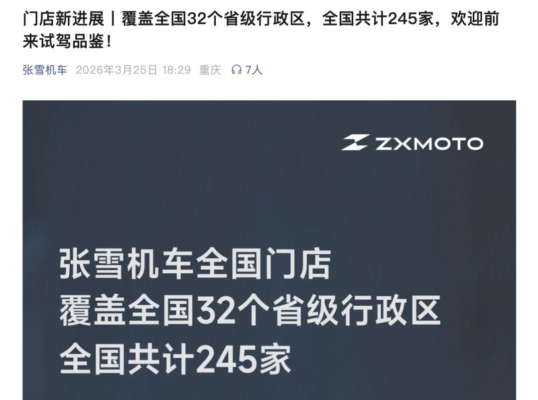 As of July 1st, 2025, there were only 75 offline stores of Zhang Xue Motorcycle. By March 25th, 2026, the brand's stores across the country had covered 32 provincial - level administrative regions, with a total of 245 stores opened. This means that in 9 months, the number of Zhang Xue Motorcycle stores across the country has increased by 170.