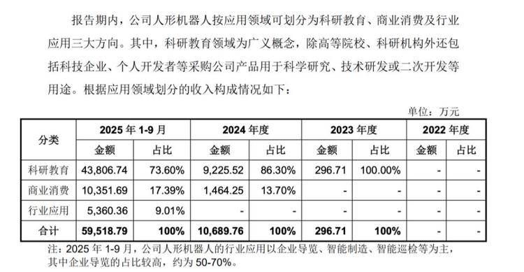 The reply to Unitree's inquiry letter disclosed on the official website of the Shanghai Stock Exchange shows that scientific research and education are still the core application scenarios for Unitree's humanoid robots. In the first three quarters of 2025, the revenue from the scientific research and education field accounted for 73.6% of Unitree's total humanoid robot revenue, commercial consumption accounted for 17.39%, and industry applications only accounted for 9.01%.