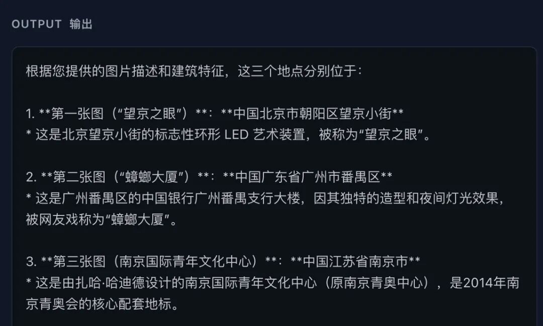 LongCat-Next accurately identified the "Wangjing Eye" in Beijing, the Bank of China Tower in Guangzhou, and the Nanjing Youth Olympic Center, and had some knowledge of the background information of each landmark building.