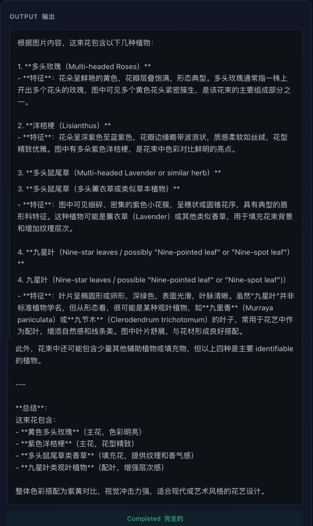 The model accurately identified yellow spray roses, purple lisianthus, sage - like herbs, and foliage plants, and gave relatively detailed descriptions of their colors and shapes. It also actively supplemented an analysis of the overall color - matching style of the flower bouquet.