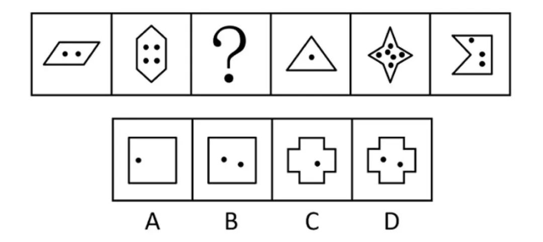 LongCat-Next grasped the key. Each graphic consists of two elements: an outer frame and internal black dots. Through horizontal comparison of multiple sets of data, it found the hidden rule that "the number of sides of the outer frame - the number of black dots = 2", and finally locked in answer B.