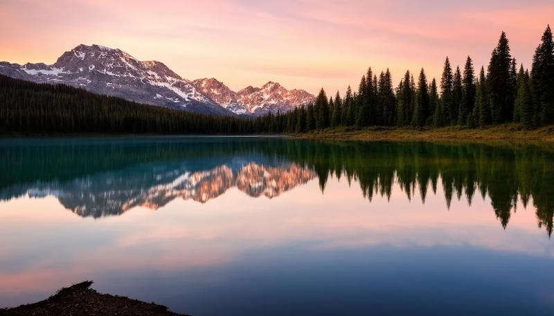 prompt: A crystal clear mountain lake reflecting snow - capped peaks at sunrise. Still water, mirror - like reflection, pink and gold sky, pine trees along the shore.