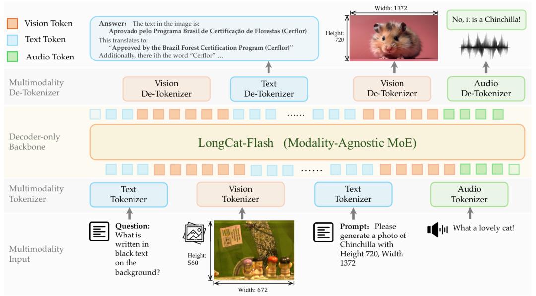 This is a discrete native autoregressive multimodal large model built on the LongCat-Flash-Lite MoE architecture. It has a total of 68.5B parameters and only 3B active parameters, capable of simultaneously processing three modalities: text, images, and audio within a unified framework.