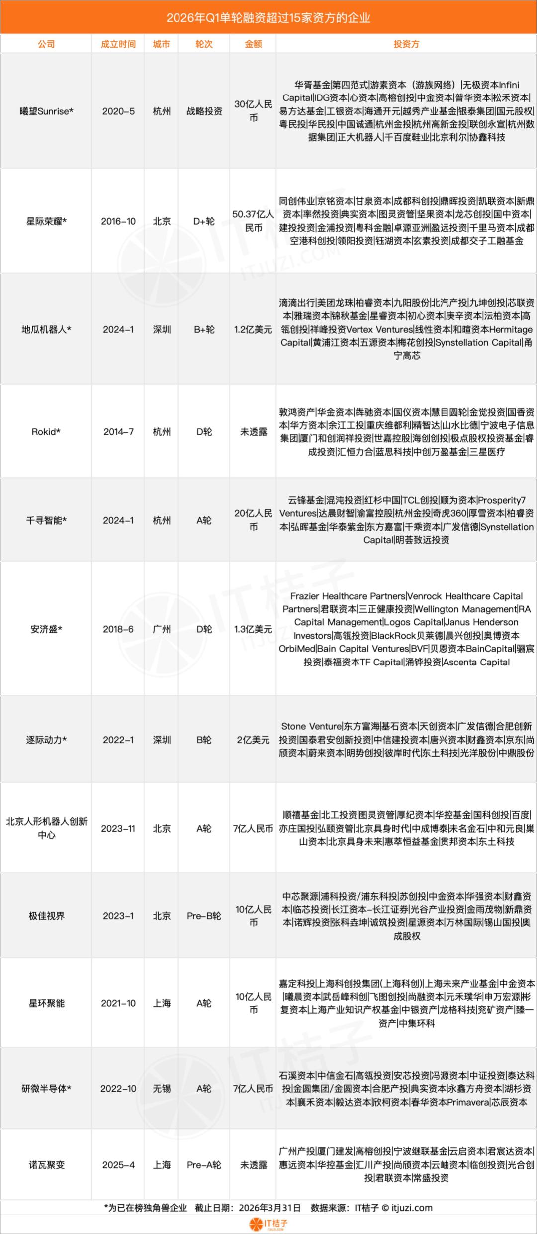 From the perspective of the number of investors, the threshold for the "most popular companies" in the first quarter was raised to more than 15 investors. Hangzhou Sunrise led the pack with 27 investors. This AI infrastructure - layer company founded in 2020 secured 3 billion RMB in a strategic investment round, becoming the company with the most investors in a single round in that quarter. Closely following were Interstellar Glory in the commercial space field (24 investors, 5.037 billion RMB in the D+ round) and Sweet Potato Robotics in the robotics track (22 investors, 120 million US dollars in the B+ round).