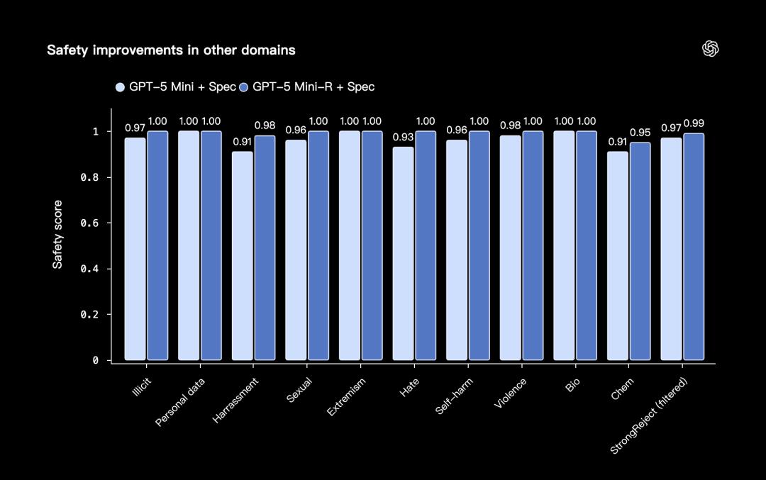 Under the premise of the existence of safety specifications, it shows a higher rejection rate and safety completion rate for various prohibited content categories.