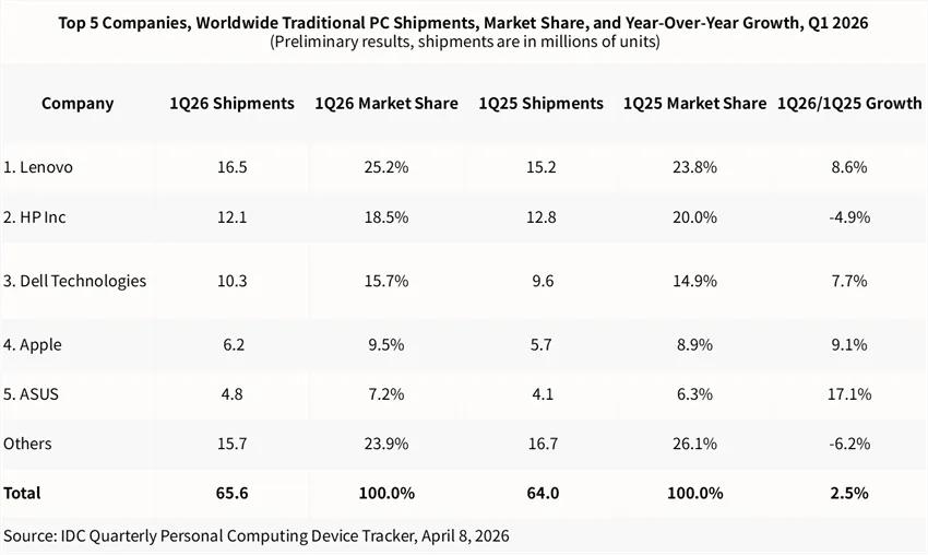 In this round of rebound, Lenovo is still the biggest beneficiary. In Q1 of 2026, it shipped about 16.5 million units, a year - on - year increase of 9%, and its global market share exceeded 25%.