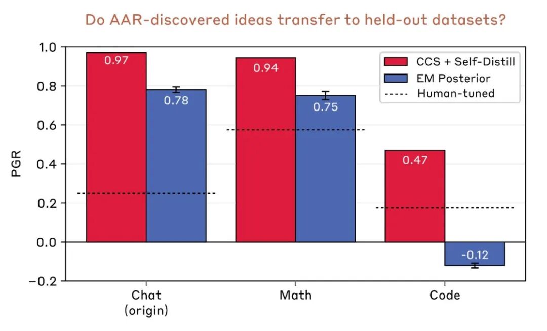 In the mathematics task, an AAR found that the most common answer to each question is usually the correct one. So it skipped all the complex training steps and directly told the strong model to "choose the option that appears most often". No more learning, just vote.