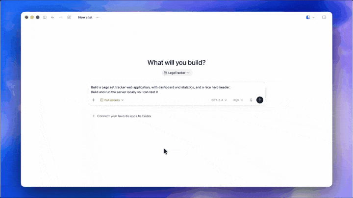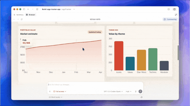 Codex writes the code from scratch, configures the environment, starts the local server, and then opens the rendered page in the built-in browser. The whole process only takes a few seconds.