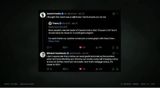 Thariq Shihipar, an expert in developer relations at Anthropic, sometimes says some confusing things on Twitter, such as: "Our terminal user interface is now a game engine."