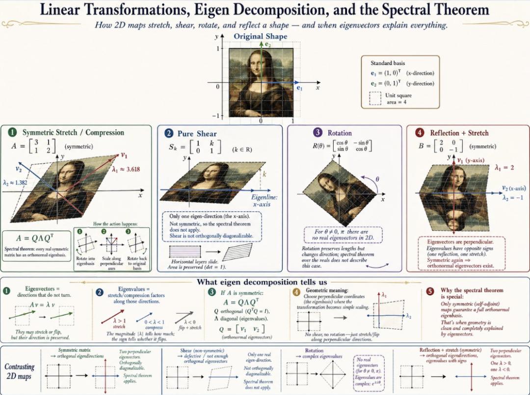 @doodlestein tested GPT Image 2 by using the same prompt to draw a linear - algebra explanation diagram. The model drew 4 completely different versions at once: even for the same teaching of Mona Lisa + eigenvectors, the composition, color scheme, and information density of each version were completely different.