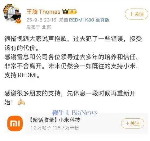“很惭愧跟大家说声抱歉,过去犯了一些错误,接受该有的代价。感谢雷总和公司各位领导过去多年的培养和信任,非常不舍离开。未来仍然会一如既往的支持小米,支持REDMI。先休息一段时候再重新开始!”