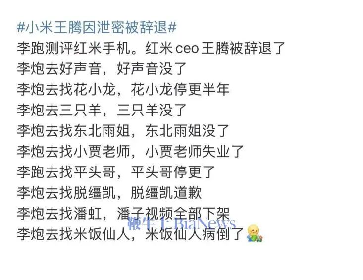 有网友还翻出了其与网红李炮的交集,8月26日,王腾邀请网红李炮测试红米新机,李炮发布测评视频,不到15天,红米CEO“寄”了。