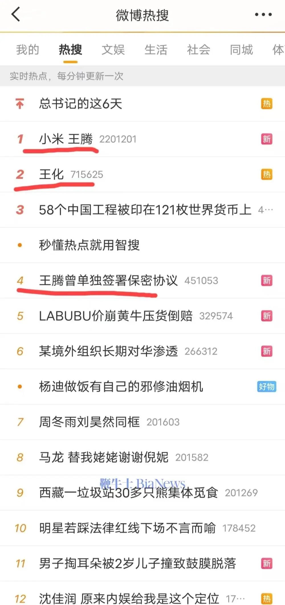 十一二点了,多个话题词轮番登上热搜榜一,一会是雷军,一会是王化称王腾曾单独签署保密协议。