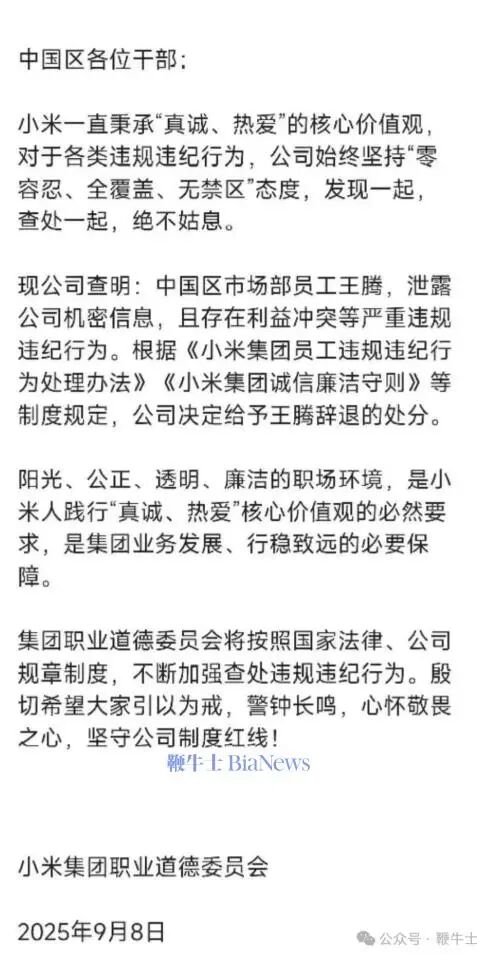 邮件显示:中国区市场部员工王腾,泄露公司机密信息,且存在利益冲突等严重违规违纪行为。根据《小米集团员工违规违纪行为处理办法》《小米集团诚信廉洁守则》等制度规定,公司决定给予王腾辞退的处分。