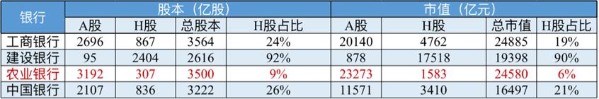 不过值得注意的是,在A+H上市的四大行中,农业银行H股流通股占比最低,也是使得其总市值“看上去”更高的客观因素。