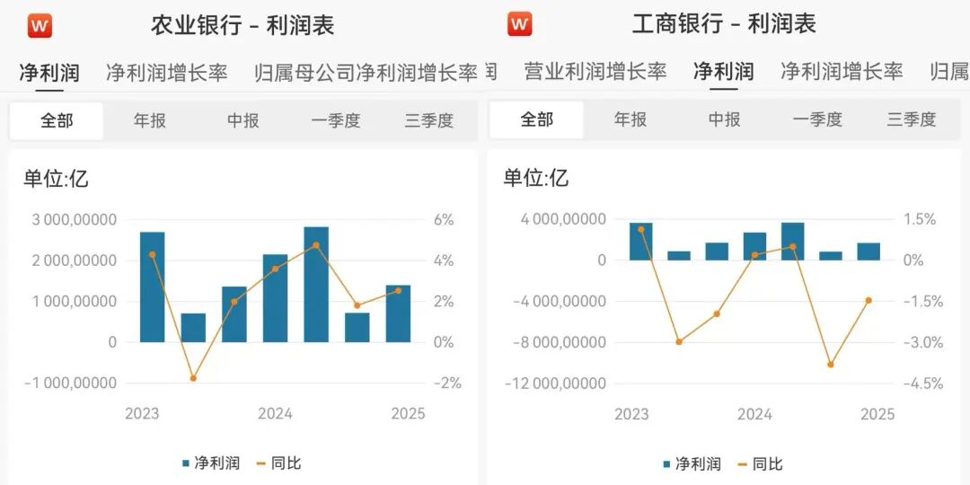 2025年上半年,国有大行继续面临息差收窄压力,工行、建行、中行净利润同比均为负增长,而农业银行实现净利润同比增长2.53%,至1399.43亿元,成为四大行中唯一保持正增长的机构。