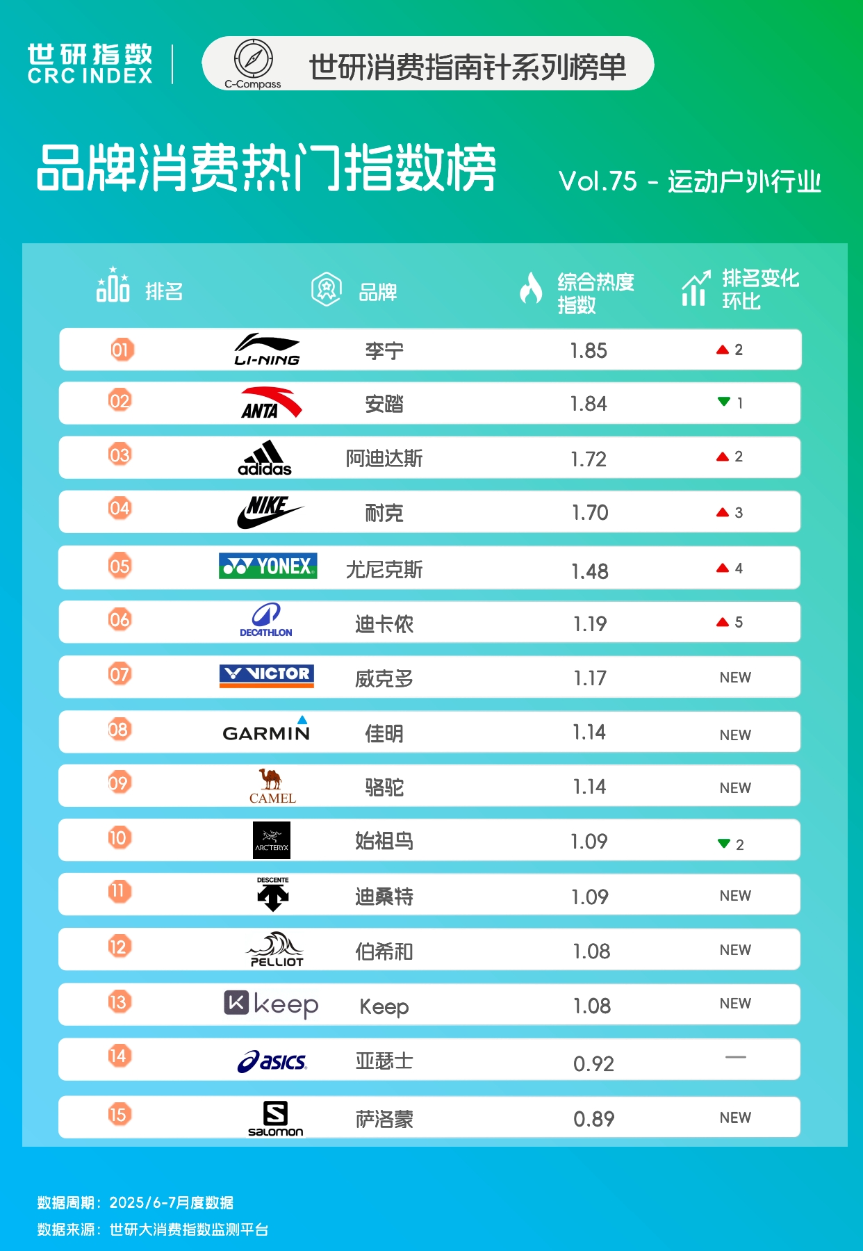 本月,安踏品牌搜索热度排名第一,主要是其发布公告,宣布完成对德国专业户外品牌 Jack Wolfskin(狼爪)业务的收购,该品牌对标大众户外,应用场景涵盖徒步、自行车、滑雪以及露营,填补中端户外市场的空白。与旗下始祖鸟、萨洛蒙等高端专业品牌,以及斐乐、迪桑特等时尚运动品牌形成协同互补。这种“品牌金字塔”结构覆盖从大众到高端、从日常运动到极限户外的全场景需求。