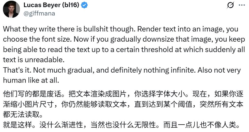 当然,批评的声音依然是存在的,比如现在 Meta 工作的前 OpenAI 和 DeepMind 研究者 Lucas Beyer 就毫不客气地表示 DeepSeek-OCR 的方法并不存在渐进性,不像人类。