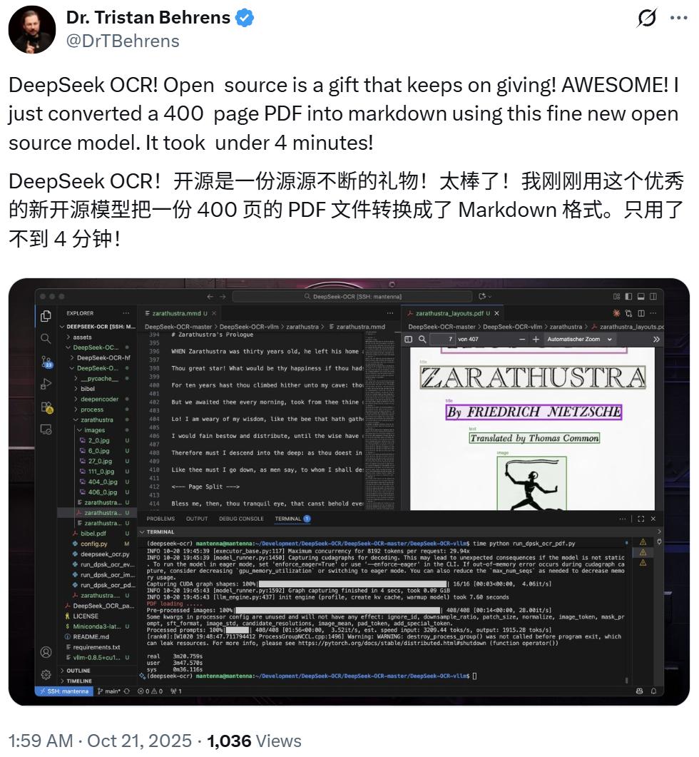 不管怎样,看起来 DeepSeek-OCR 确实是一个非常好用的模型,也已经有不少先行者开始用起来了:
