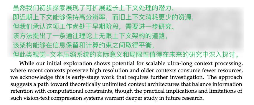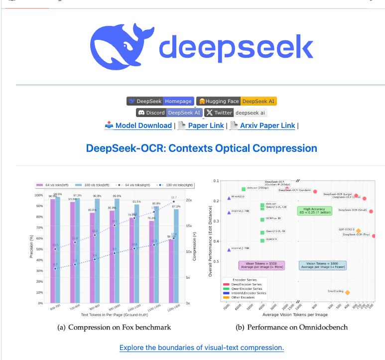 但是 DeepSeek 这次的 「技能 OCR」则是刚好相反,它可以把大量文字变成一张图片,作为 AI 的“记忆载体”。