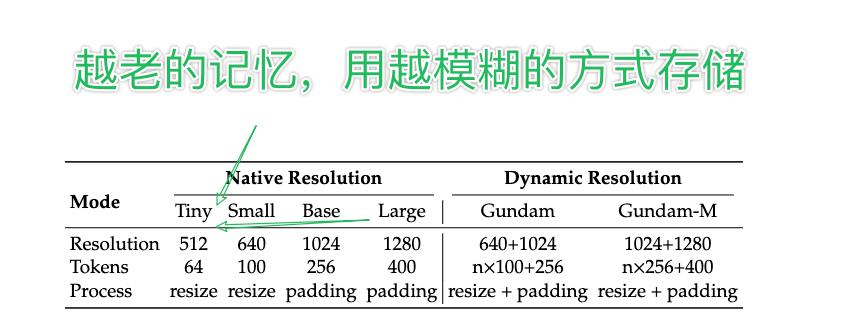 而随着时间的推移,这件事的重要性也会逐渐降低,存储它的格式也会从最大的 Gundam 一路降级,从 Large 一路降到最小的 Tiny,占用的 token 数量也会越来越少。