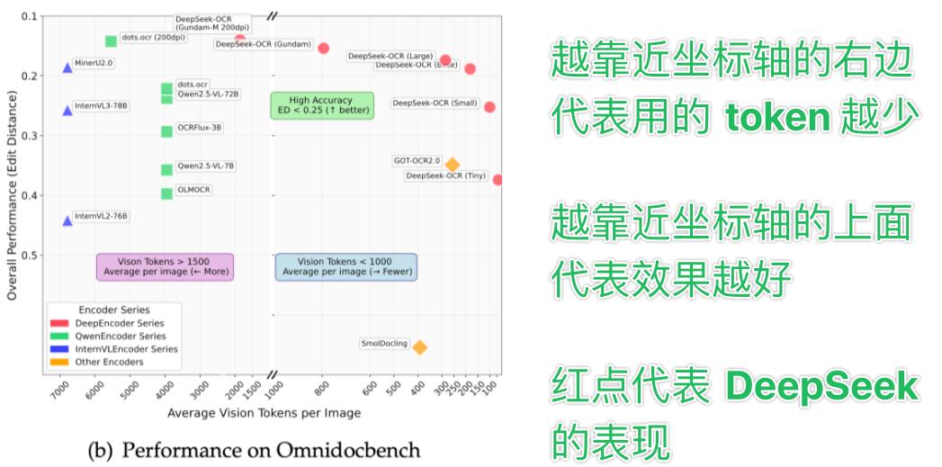 在论文里可以看到,初出茅庐的 DeepSeek-OCR,就能用原本 1/10 的token 数量,达到原模型 96.5%的准确率。