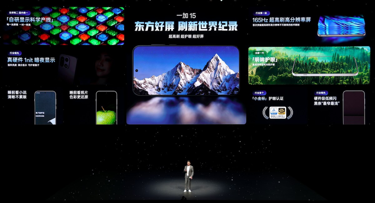 从一加 7 Pro 开启“高刷革命”,到与京东方携手推出前两代东方屏,一加不断刷新屏幕体验上限,引领中国屏幕的技术突破。今年,一加再次联合京东方,推出全球首块 165Hz 超高刷高分辨率的第三代东方屏,开启了中国屏幕的刷新时刻。第三代东方屏采用 X3 发光材料,配合全球首发「全亮度人因色貌模型」,能真实还原人眼在不同亮度下的色彩感知,视觉感受更为舒适。同时,得益于独家增强驱动技术,以及自研 Display P3 屏幕芯片,第三代东方屏可带来更优的色彩及触控响应表现。本次,一加还全面升级了全球唯二、中国唯一的「自研屏幕科学产线」,通过 121 项领先工艺,对每块屏幕进行校准,确保每块屏幕都拥有顶级显示素质。针对用户在暗光环境下的用眼舒适度,一加 15 带来了全球首发、行业领先的「真硬件 1nit 暗夜显示」,在极低亮度下,仍能带来清晰通透、柔和舒适的观感。此外,一加 15 还搭载全新一代医显共研的「明眸护眼」,通过行业唯一的 1nit+PWM 调光策略,带来出色的低频闪表现。配合硬件级低蓝光技术以七大 AI 主动护眼功能,一加 15 成功斩获行业首个莱茵 TÜV 智能护眼 5.0「小金标」认证,引领行业下一代旗舰屏幕护眼标准。