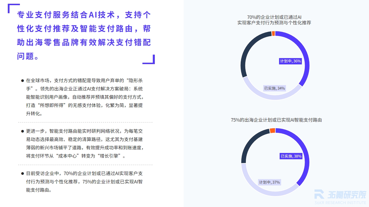 在支付层面,出海企业普遍面临三大核心挑战:支付体验优化、安全合规管理与运营降本增效。对于仍处于成长阶段的出海企业而言,借助专业第三方支付服务成为投入产出比最优的解决路径:支付体验层面,专业服务商通过整合全球支付方式、支持一键支付等功能,并结合AI技术实现个性化推荐与智能路由选择,显著提升消费者支付成功率与满意度;安全与合规层面,依托海量交易数据构建的智能风控与反欺诈系统,能够帮助品牌有效规避数据泄露与跨境合规风险;成本与效率层面,智能汇兑、动态结算等支付优化工具可显著降低货币转换与支付处理成本,加速资金周转,提升整体财务效率。