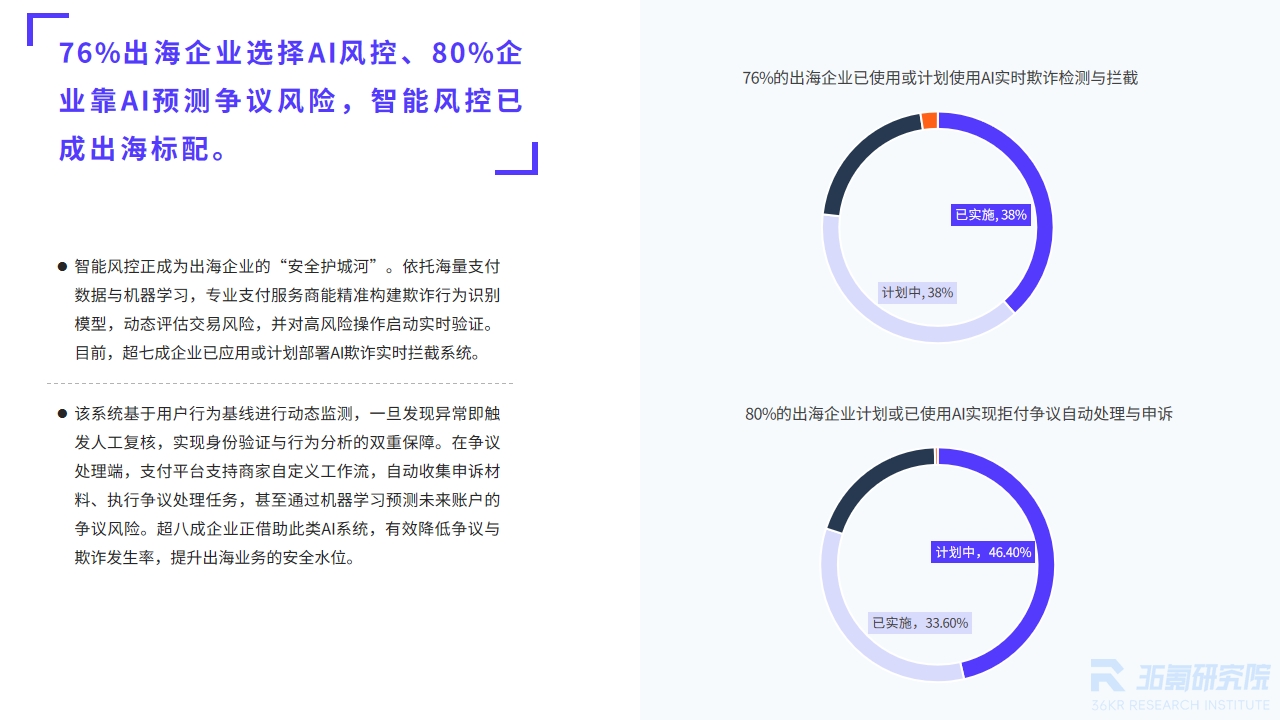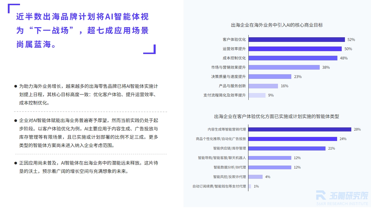 生成式AI的迅猛发展正推动“智能体商务”迅速普及。这一新兴模式通过AI智能体重塑消费流程、拓展销售场景,并显著提升运营效率。值得强调的是,智能体商务并非孤立存在,而是与一体化商务深度耦合:在AI赋能下,品牌能够实现超高效、高度个性化的无缝体验,形成“一体化×智能化”的倍增效应,开辟全新增长空间。然而,目前出海企业对AI智能体的应用仍处于探索阶段,其在营销推荐、供应链优化、支付风控等环节的潜力尚未充分释放,未来增长前景广阔。