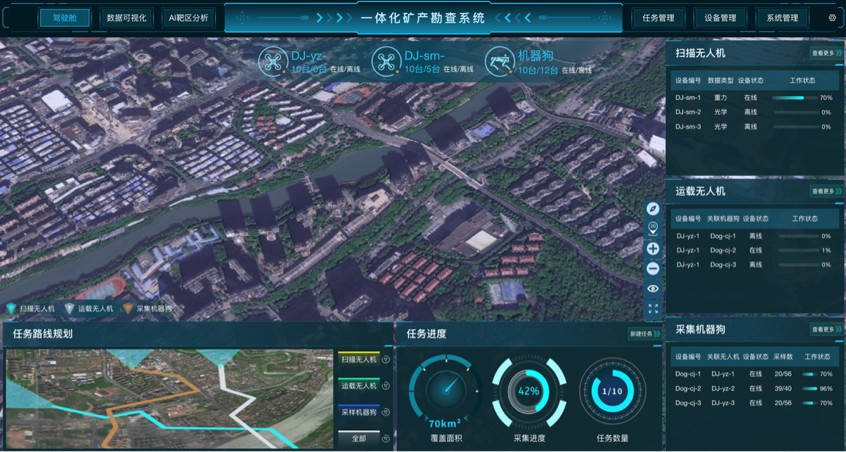 接着,无人机群如同灵巧的飞鸟登场。它们搭载热成像、磁力仪、激光雷达等先进传感器,在山川之间穿梭扫描。三维地形、电磁异常、激光点云等多元数据在空中交织成网,将广袤区域的每一寸信息尽收眼底。那些人类需要数月甚至更久才能徒步勘查的地带,无人机只需几天就能完成精密扫描。