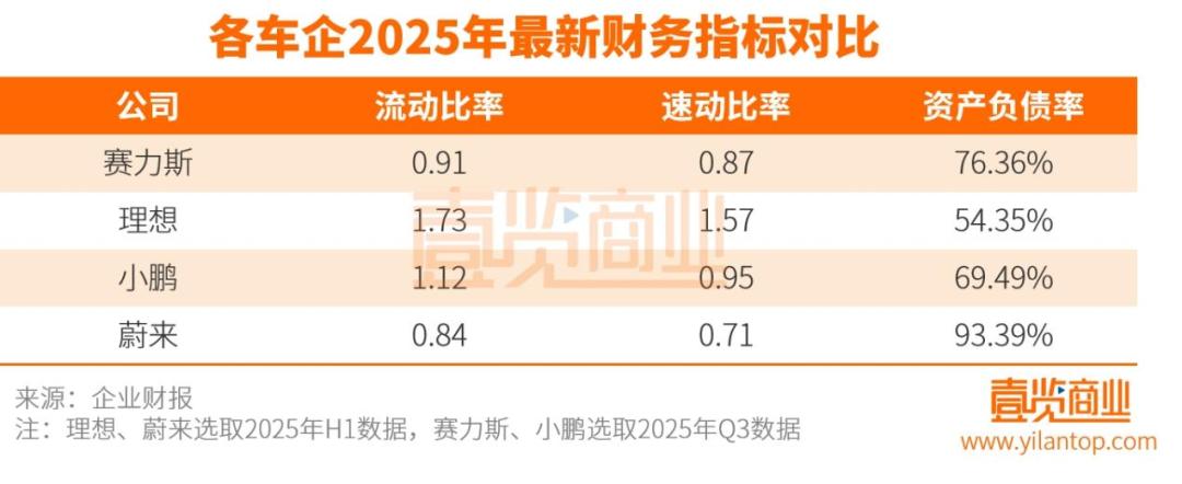 与此同时,赛力斯的流动性状况并不理想。2025 年第三季度,公司流动比率为 0.91、速动比率为 0.87,均低于安全线 1,也低于理想和小鹏这两家已进入稳定经营阶段的新势力。理想同期流动比率达到 1.73,小鹏为 1.12。从偿债能力看,赛力斯账面可快速变现的资产仍不足以覆盖短期负债,经营现金流必须保持在较高水平才能支撑日常资金周转,这意味着公司对销量、回款、经营节奏的依赖度远高于同行。